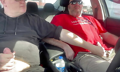 Stroking our Jizz-shotguns In car in a parking lot