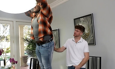 Busty zaddy cocksucked by bony twink